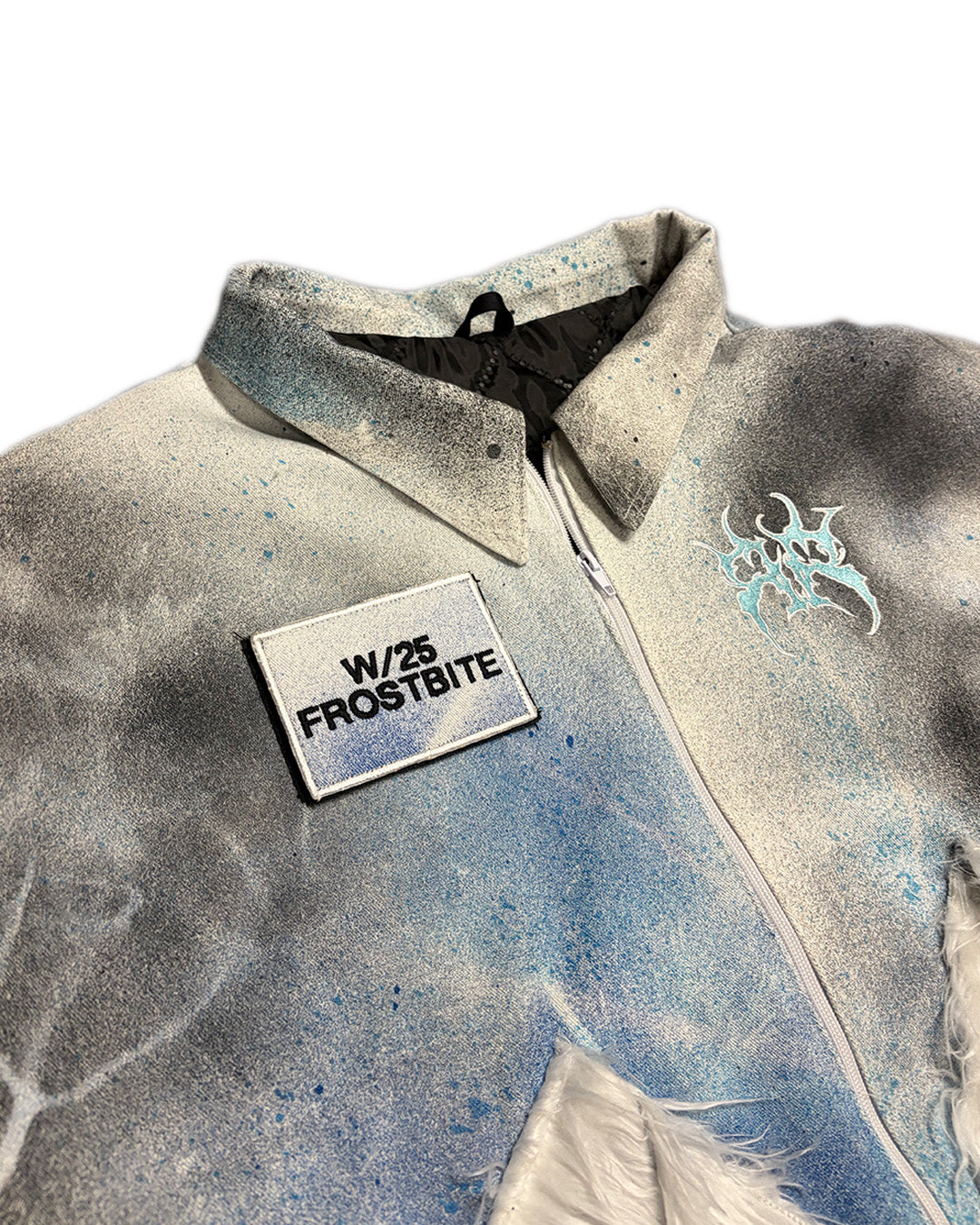 Bunda z zimní kolekce W/25 Frostbite, navržená s ledovým, ručně vytvářeným estetickým stylem.